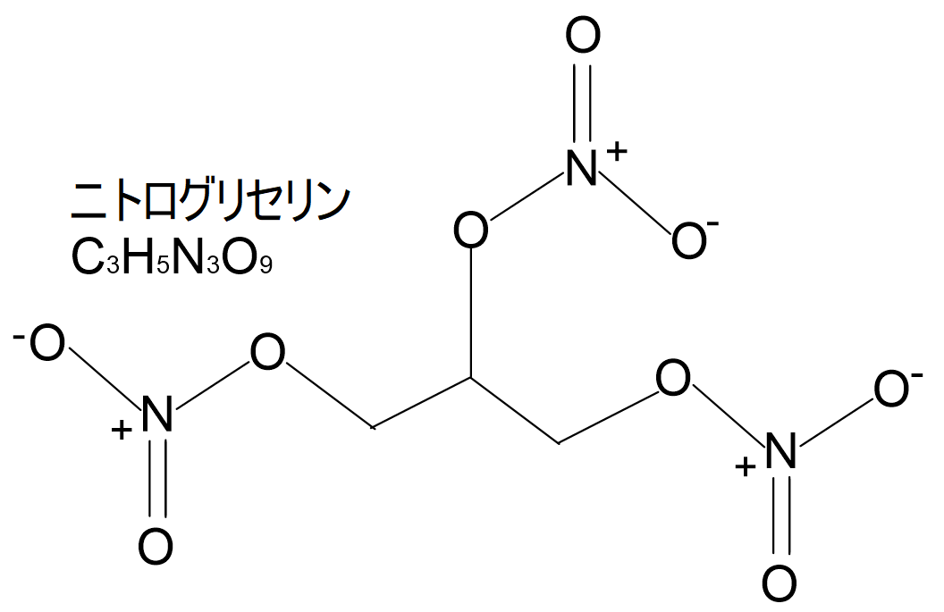| ニトログリセリン | 無色の油状の液体 ・有毒 | ・水にはほとんど溶けないが、有機溶剤にはよく溶ける。 ・8℃で凍結して爆発の危険性がある。 | ・加熱、衝撃、摩擦などを避ける。 ・容器は密栓して換気のよい冷暗所に貯蔵する。 | ||