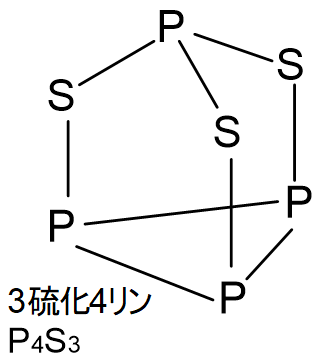 | 硫化リン | 三硫化四リン | 2.03 | 172.5℃ | - | 100℃ | 407℃ | ・水に溶けないが、二硫化炭素、ベンゼンには溶ける。 |