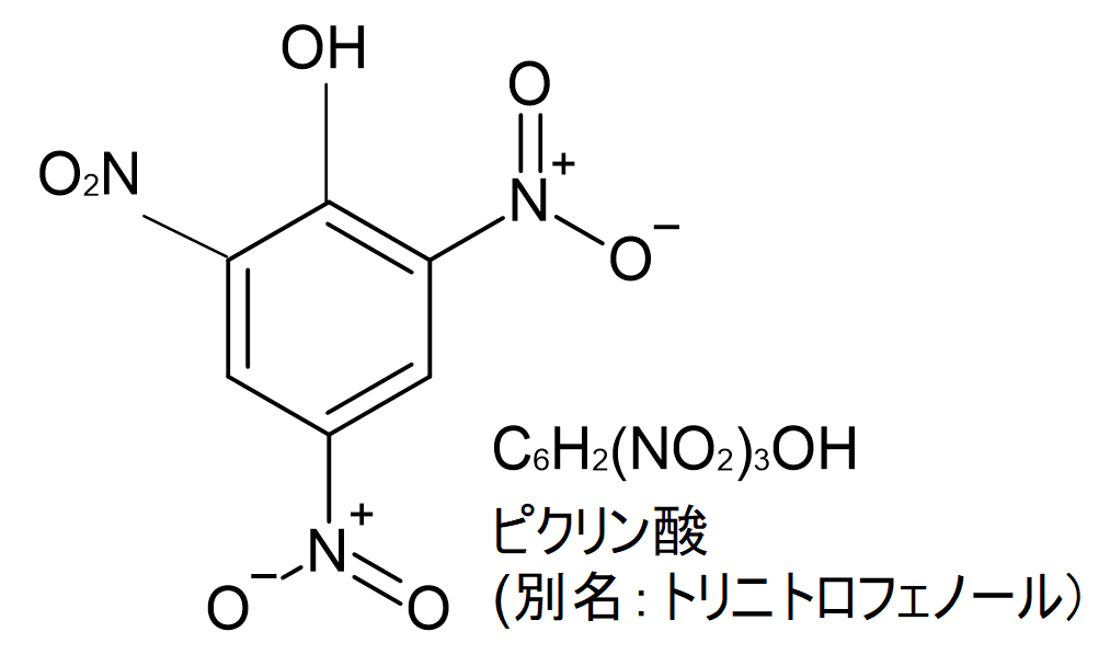 | ニトロ化合物 | ピクリン酸 | 1.8 | 122℃~123℃ | 150℃ | 300℃~320℃ | 255℃ | ・毒性がある ・水溶液は強酸性 ・火薬の原料に用いられる |