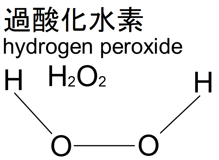 | 過酸化水素 | 過酸化水素 | ![]() | 無色の粘性のある液体 | ・分解すると発熱する ・不安定な物質で一定濃度以上になると分解して水と酸素を発生させる、熱や光にあてると水と酸素に分解する ・アルカリ性のアンモニアと接触すると爆発する ・分解を抑制するため安定剤としてリン酸・尿酸・アセトアニリドが使用される ・過酸化水素の3%の水溶液に安定剤を加えたものは、医療用の消毒剤として利用されオキシドール・オキシフルと呼ばれる | ・分解して酸素を発生するため、容器は密栓せず、穴の開いた栓をして通気性を保つ。 |