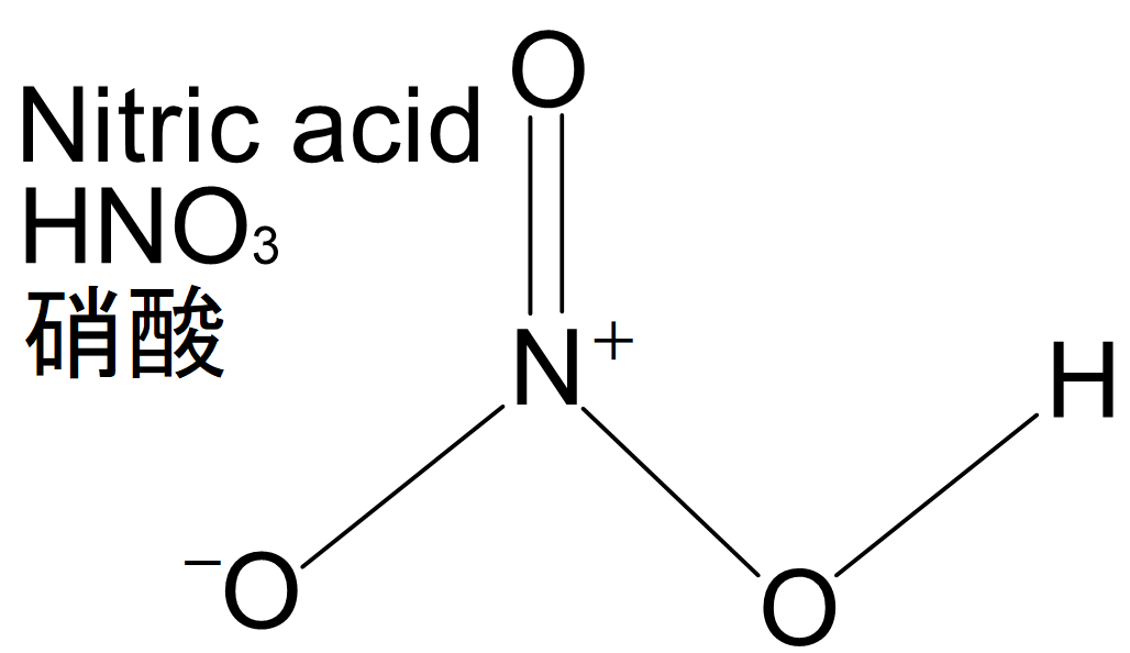 | 発煙硝酸 | - | 赤色・赤褐色の発煙性液体 | ・硝酸より酸化力が強い ・空気中で有毒な褐色の二酸化窒素の蒸気を発生させる ・その他は硝酸とほぼ同じ | ・硝酸と同じ | |