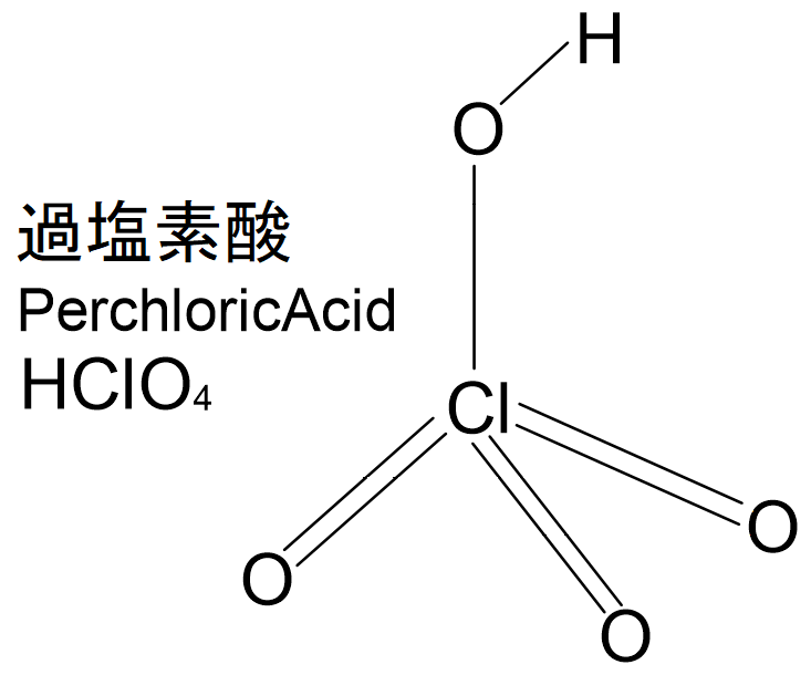 | 過塩素酸 | 過塩素酸 | ![]() | 無色の発煙性液体 | ・空気中で発煙する ・水溶液は強酸性 ・密閉した容器にいれて貯蔵しても次第に黄変し、分解生成物が触媒となり分解をし続ける ・水を加えると音を発して発熱する ・水溶液は強酸性の為、金属・非金属を酸化し、腐食する ・蒸気は強い腐食性がある。 | ・可燃物や有機物、還元性物質、金属との接触を避ける。 ・容器は密栓して通風のよい乾燥した冷暗所に貯蔵する。 |